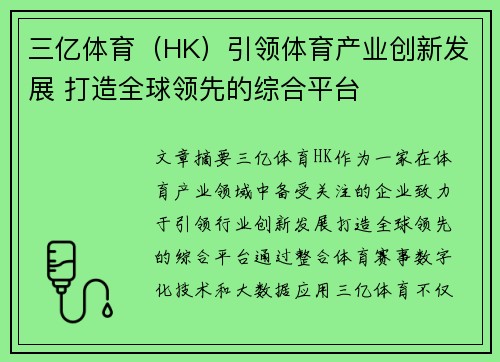 三亿体育(HK)引领体育产业创新发展 打造全球领先的综合平台
